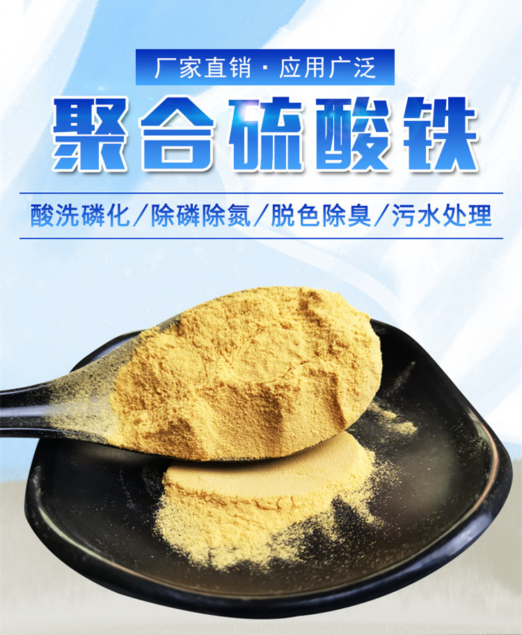 新型、优质、高效铁盐类无机高分子絮凝剂,主要用于净水效果优良,水质 好,不含铝、氯及重金属离子等有害物质,亦无铁离子的水向转移,无毒,无害,安全可靠, 除浊、脱色、脱油、脱水、除菌、除臭、除藻、去除水中COD、BOD及重金属离子等功效显著等。也用于工业废水处理,如印染废水等,在铸造、造纸、医药、 制革等方面也有广泛应用。
