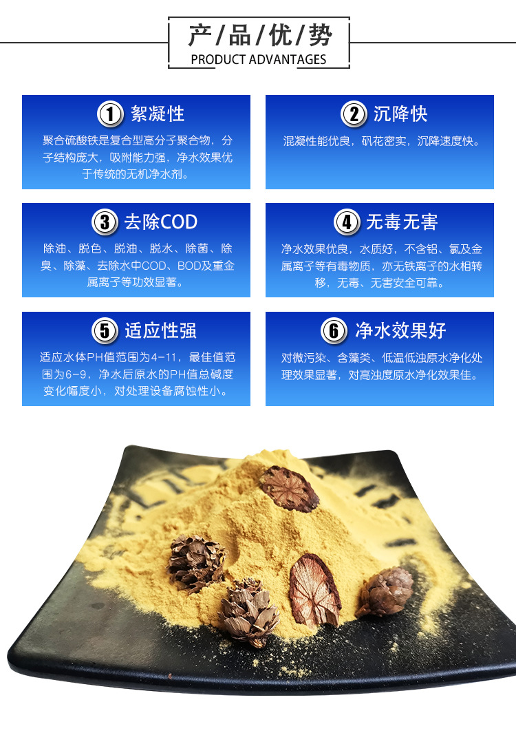 聚合硫酸铁按状态分为液体和固体两种,液体是均相红褐色粘稠透明液体,比重≥1.45g/cm3,粘度(20℃)>10厘泊。固体是淡黄色无定型粉状固体,有较强的吸湿性。聚合硫酸铁是一种新型无机高分子混凝剂,无毒无害,化学性质稳定,能与水混溶,在水处理过程中,聚合硫酸铁能很快形成大量的[Fe2(OH)3]3+,[Fe2(OH)2]4+,[Fe8(OH)20]4+等多核络离子,极易生成絮体,凝聚性能较好。而且耗量少、降速度快、PH适用范围宽、水中残留铁离子少、水解产物脱水性能优良,重金属的去除率高,出水质量优良,处理成本低。优于聚合氯化铝、硫酸铝、三氯化铁等其他混凝剂。
